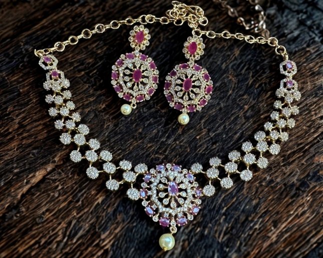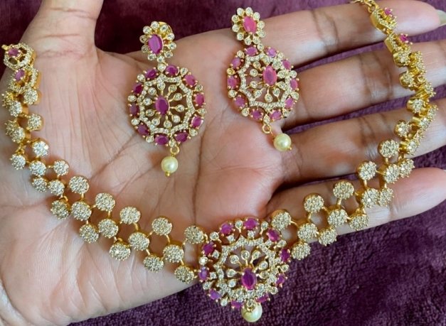 A beautiful artificial American diamond short necklace with ruby stones comes matching earring.