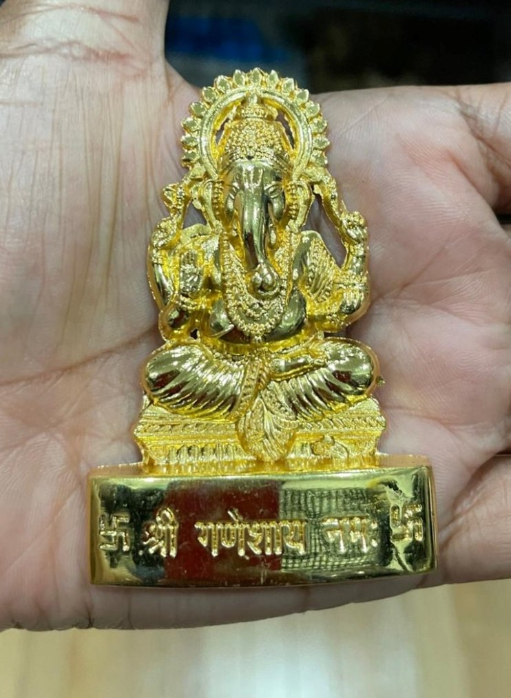A gold plated Ganesh idol for return gifts and best suits for car dashboard.