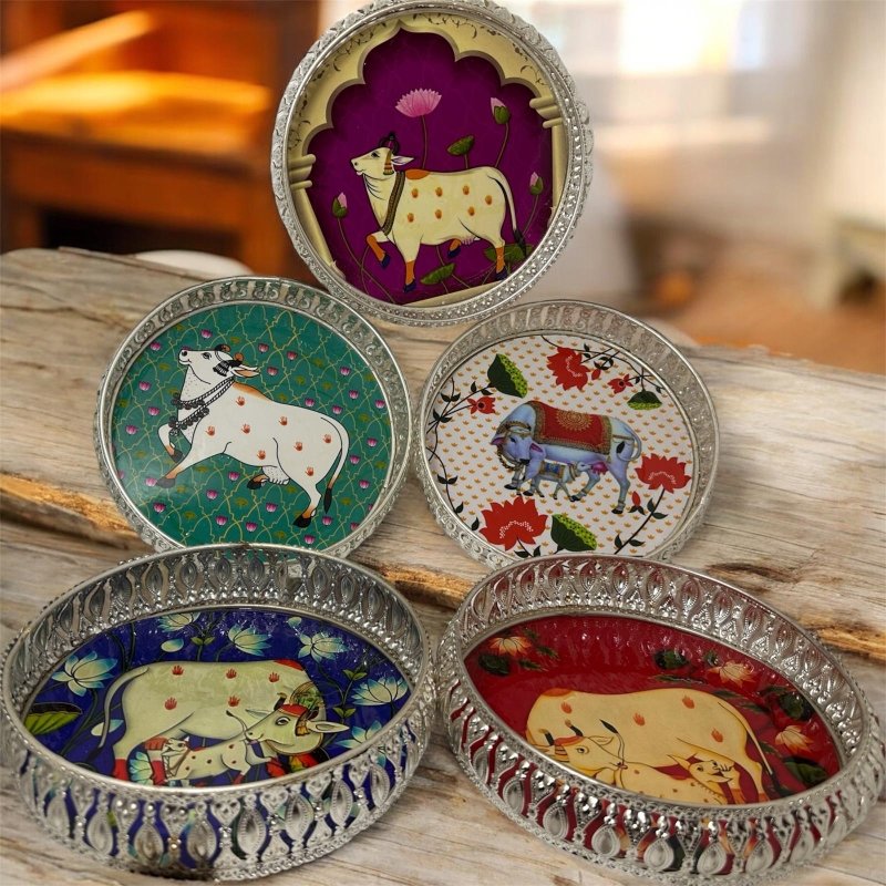 A beautiful German silver pichwai tray in 8 inches comes with different colors.