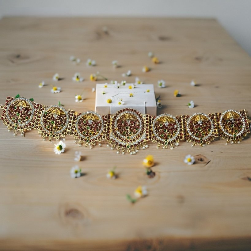 A beautiful Kemp hib belt for Bharatanatyam with white stones.