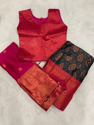 Kids Pattu Pavadai Set – Elegant Rose blouse, paired with a Dark Peacock silk skirt and matching zari dupatta. Perfect festive wear for weddings, functions, and cultural celebrations.