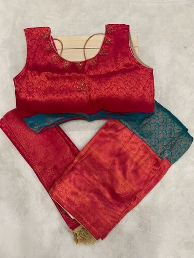 Kids Pattu Pavadai Set – Elegant Rose blouse with a Blue silk skirt and matching zari dupatta. Perfect festive wear for weddings, cultural events, and special occasions.