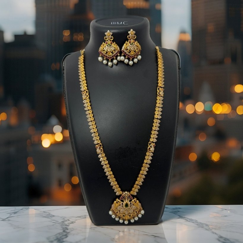A beautiful long haram with emerald, ruby and pearls comes with the matching earring.