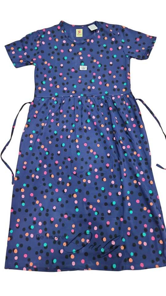 Comfortable navy blue maternity dress with colorful polka dots, short sleeves, and adjustable tie-up waist for a perfect fit. Ideal for daily wear, casual outings, and pregnancy comfort.