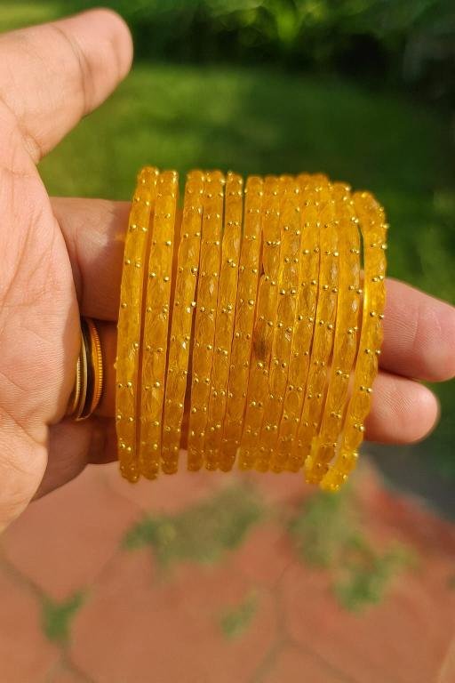 A beautiful orange color raindrop glass bangles comes with different sizes.