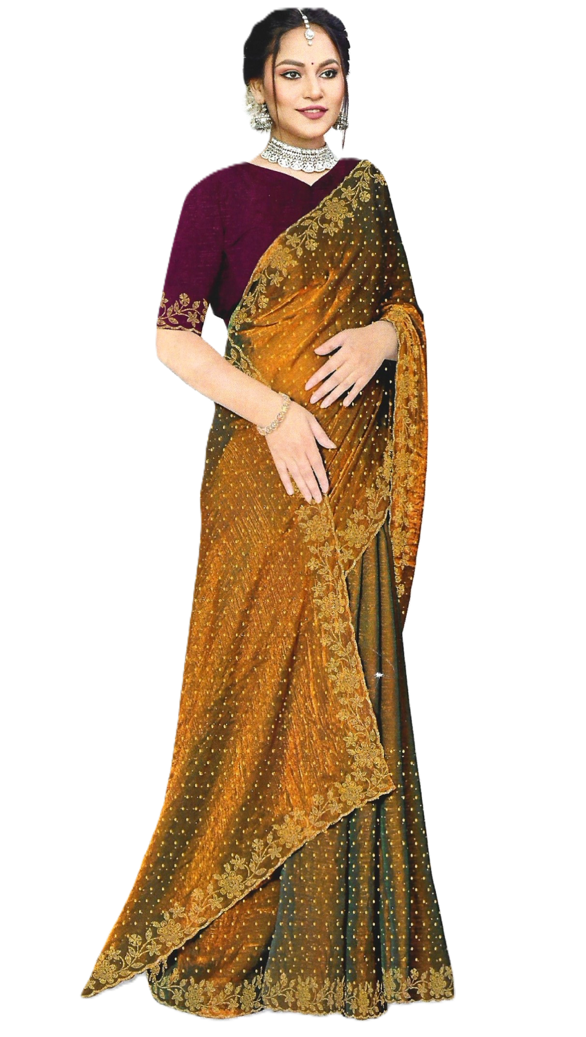 A trending space silk saree with contrast blouse.