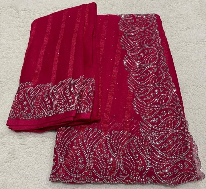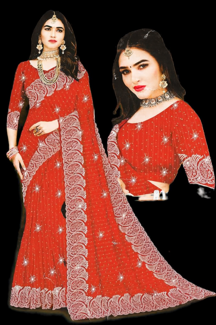 A trending stone work saree comes with the matching blouse.
