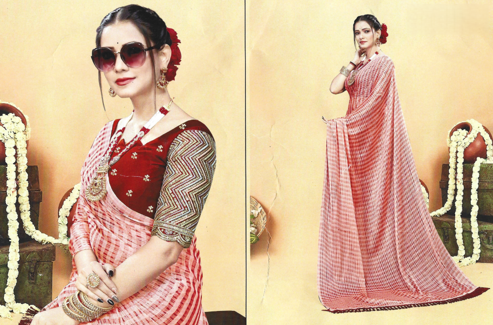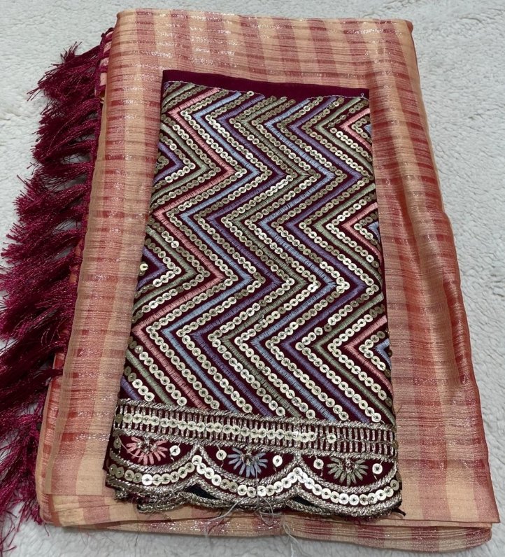 A trending light weight soft tissue saree comes with the contrast designer blouse.