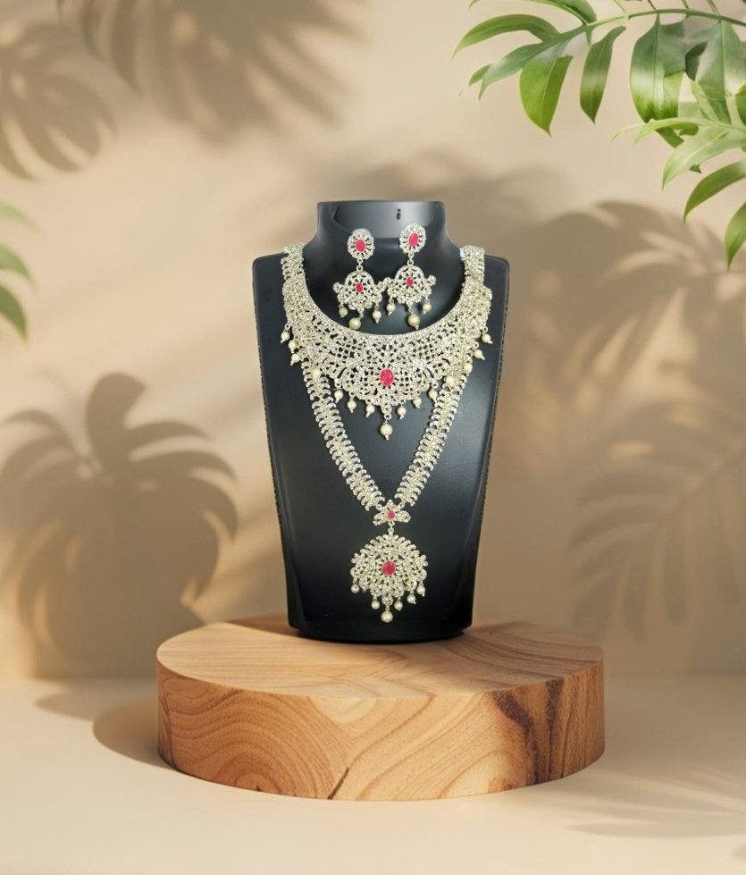 Beautiful silver choker and long haram with matching earrings and tiki.